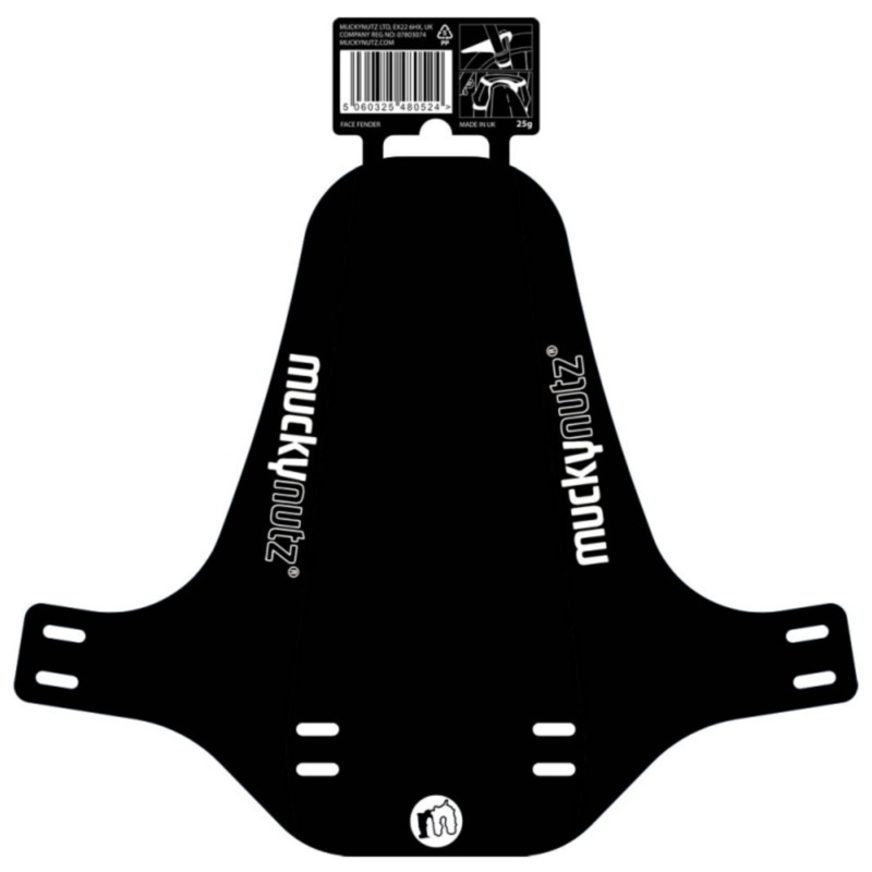 Mucky Nutz Face Fender: Black. Stops muck sand or snow from being flung into riders face.Can be used on all wheel sizes Protects fork stanchions seals and bridge from debris reducing the need for cleaning and servicing Uses Velcro straps to attach to the b